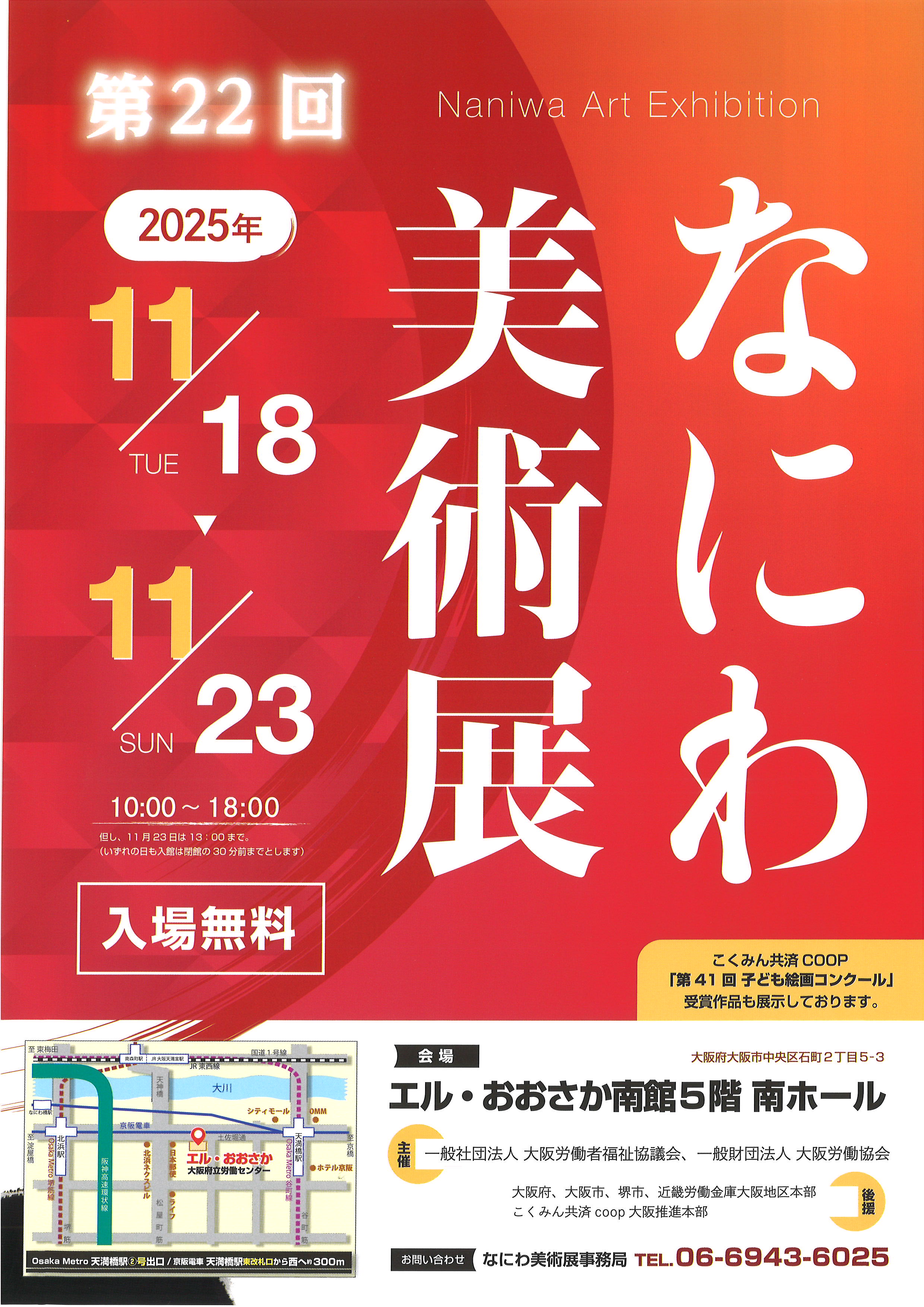 大阪労働者福祉協議会・大阪労働協会主催による「第22回なにわ美術展」が11月18日から11月23日に開催されます。 会場は、エル・おおさか南館5階南ホールです。 【開場時間】 10時〜18時 【入場料】 無料